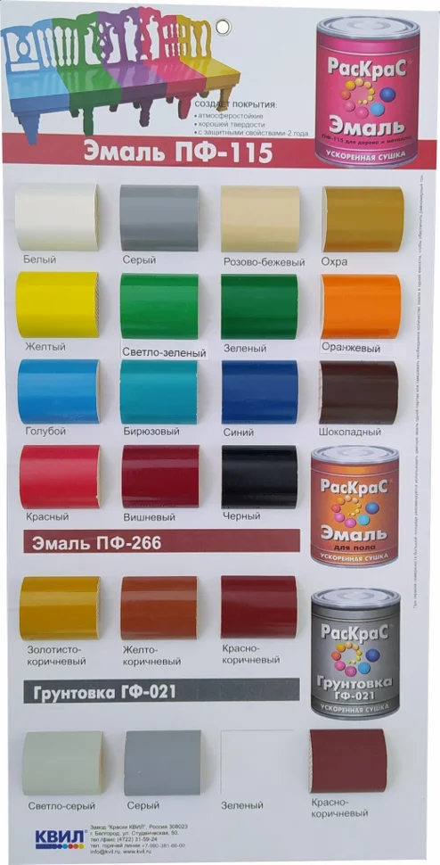 Эмаль отличается широкой палитрой цветов. Покрытие обладает высоким блеском, хорошей твердостью, устойчиво к кратковременному воздействию воды и растворам бытовых моющих средств.